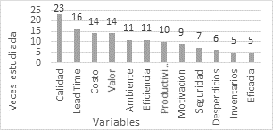 En la Fig. 5 se puede visualizar las variables que se han estudiado durante la aplicación de las herramientas Lean. Se han ordenado de forma descendente de acuerdo con el número veces que se han estudiado por los diferentes autores.