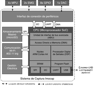 Este sistema, sintetizado en la Fig.1., se compone de un microprocesador System-on-Chip (SoC), encargado del funcionamiento principal de Imocap, procesamiento de la información y coordinación de las tareas en ejecución; interfaces de conexión de periféricos que permiten la reconfiguración del dispositivo para múltiples aplicaciones; unidad de almacenamiento masivo, dando soporte a recolección de datos de manera local; comunicación inalámbrica vía Wi-Fi con diversos modos de operación; y un sistema de gestión eléctrica que otorga versatilidad y mayor capacidad de autonomía.