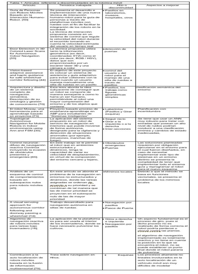 En la tabla 1 se resumen varios artículos de interés referente a discontinuidades en la robótica móvil.