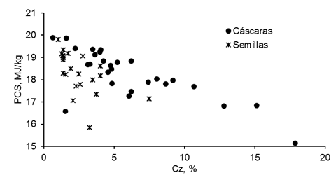 También se aprecia que, en términos generales, las cáscaras de frutas tienen mayor PCS que las semillas. No obstante, se recomienda utilizar como combustible las semillas en lugar de las cáscaras, pues estas presentan menor porcentaje de Cz, por lo cual se espera obtener menos incrustaciones en las paredes de la caldera, si las Cz son de carácter básico. Sin embargo, si las Cz son de carácter ácido, las Cz de las semillas producirán menor corrosión en las paredes de las calderas que las Cz producidas en la combustión de las cáscaras [8][19]. Además, el aumento en el contenido de Cz, afecta (disminuye) la velocidad de encendido en el proceso de combustión [20]. Asimismo, un menor contenido de cenizas hace que se tenga un menor volumen de material a disponer. Esto conlleva a reducir costos en disposición de residuos y en mantenimiento de las calderas [19]. De igual forma, para la pirólisis, se recomienda emplear residuos con menor contenido de cenizas, esto con el fin de que el biosólido obtenido en la pirólisis, no contenga cantidades considerables de Cz que provoquen problemas al utilizarlo como combustible [8][19].