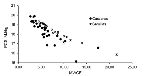 Para analizar el aprovechamiento potencial de los residuos de frutas como materia prima en combustión y pirólisis se realizaron los siguientes gráficos entre: poder calorífico superior (PCS) y contenido de cenizas (Cz) en la Fig. 1, PCS e índice de combustibilidad (MV/CF) en la Fig. 2, MV/CF y relación atómica H/C en la Fig. 3, poder calorífico y relación atómica O/C en la Fig. 4, y entre la relación atómica H/C y la relación atómica O/C (diagrama de Van Krevelen) en la Fig. 5. En la Fig. 1 se observa que existe una relación lineal entre el Cz y el PCS. Este comportamiento es claro en las cáscaras de frutas, pero menos claro en las semillas. De igual manera, se encuentra que alrededor del 90% de las semillas tienen un PCS entre 17 y 19 MJ/kg con contenidos de Cz menores al 5%, mientras que, para ese mismo porcentaje, las cáscaras presentan valores de PCS entre 17 y 20 MJ/kg con contenidos de Cz menores al 10%. Esto indica que hay una mayor variación del contenido de Cz y PCS en las cáscaras que en las semillas de frutas.