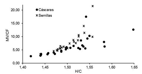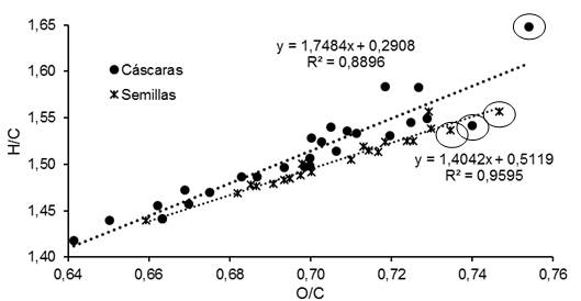 Como se puede ver en esta figura, tanto para las semillas (R2=0,96) como para las cáscaras (R2=0,89) la relación atómica H/C se puede expresar como una función lineal de la relación atómica O/C [23]. Analizando los coeficientes numéricos de las correlaciones presentadas en la Fig. 5, se encuentra hay diferencia entre las cáscaras y las semillas. Esto puede indicar que cada tipo de biomasa tiene su propia correlación característica. Esto se puede explicar debido a que las cáscaras y las semillas tienen diferentes contenidos orgánicos estructurales (celulosa, hemicelulosa y lignina), extractivos y minerales [24]. En general, las cáscaras presentan un alto contenido de celulosa y hemicelulosa, en cambio, las semillas tienen mayor porcentaje de lignina. En el caso de la pirólisis, los residuos con alto contenido de hemicelulosa producirán gases no condensables y baja cantidad de alquitrán, mientras que los residuos con mayor porcentaje de celulosa generarán gases condensables y una cantidad insignificante de carbón. Los residuos ricos en lignina producirán compuestos aromáticos y carbonizados, asimismo la pirólisis de la lignina contribuye al rendimiento del líquido, el cuál contendrá bioaceites y alquitrán [8].