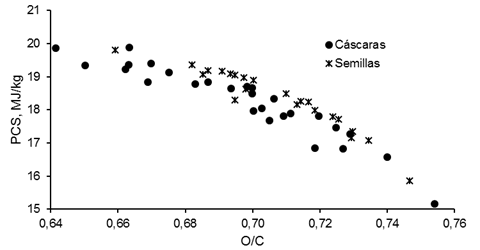 En la Fig. 4 se muestra la variación del poder calorífico superior con la relación atómica O/C de los residuos de frutas. Aquí se puede ver que una mayor relación atómica O/C hace que el PCS disminuya [21]. Esto indica que la presencia de oxígeno en el residuo no contribuye al PCS y dificulta la transformación de los residuos en combustibles líquidos en el proceso de pirólisis [10]. Esto se debe a que el oxígeno consume parte de hidrógeno para producir agua. Sin embargo, un alto contenido de hidrógeno y oxígeno en los residuos resulta en un mayor rendimiento de producción de volátiles y líquidos durante el proceso de pirólisis [7]. Igualmente, en esta figura se aprecia que, en general, las semillas tienen un mayor contenido de oxígeno que las cáscaras, confirmado los resultados mostrados en la Tabla 2 Este diagrama (PSC vs. O/C) también sirve para establecer comparaciones entre el PCS de diferentes residuos respecto al análisis último [21]. Allí se establece que los residuos con una alta relación atómica O/C (mayor contenido de oxígeno y menor contenido de carbono) tienen un PCS menor que aquellos que tiene altos valores de las relaciones atómicas O/C y H/C (mayor contenido de carbono) [21].
