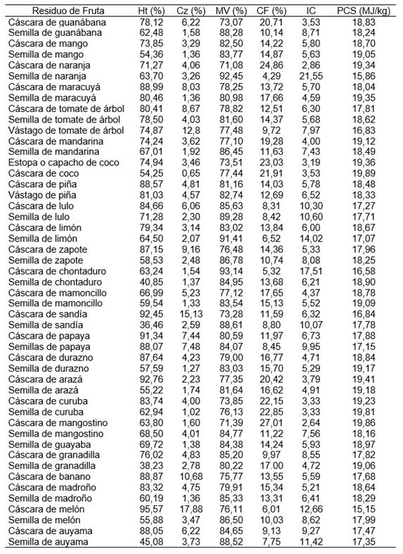 Las Tabla 1 y Tabla 2 muestras los resultados del análisis próximo completo y del análisis elemental, respectivamente, obtenidos experimentalmente en este trabajo. La Tabla 1 presenta los resultados del análisis próximo en base seca, índice de combustibilidad (MV/CF) y poder calorífico superior (PCS) de los 49 residuos de frutas (entre cáscaras, semillas, vástagos y estopa). Se observa que el contenido de cenizas (Cz) de estos residuos esta entre 0,65% (cáscara de coco) y 17,88% (cáscara de melón). De igual forma se aprecia que las semillas presentan un menor contenido de Cz (por debajo del 5%), comparado con las cáscaras. El contenido de MV varía entre 71,08% (cáscara de naranja) y 93,14% (cáscara de chontaduro). En general, se observa que las cáscaras reportan menor contenido de MV comparado con las semillas. Esto posiblemente se debe a que parte de la MV presente en la mayoría de las cáscaras es de bajo peso molecular (con baja temperatura de evaporación), mientras que en las semillas se presenta MV de alto peso molecular (con altas temperatura de evaporación) [15].