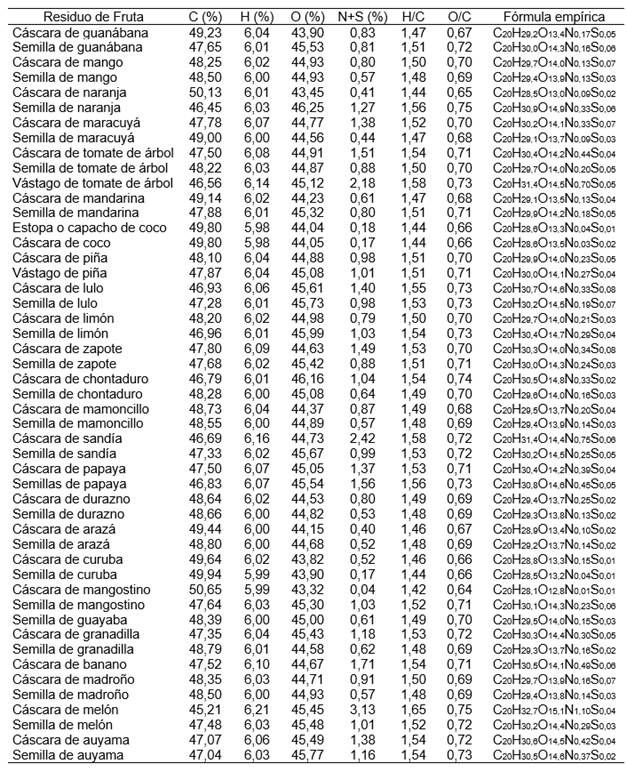 En la Tabla 2 se muestran los resultados del análisis último en base seca libre de cenizas, las relaciones atómicas H/C y O/C, y las fórmulas empíricas de 49, residuos de frutas (entre cáscaras, semillas, vástagos y estopa). Del análisis último se encuentra que el contenido de carbono varía entre 45,21% (cáscara de melón) y 50,65% (cáscara de mangostino). En términos generales, se encontró que las cáscaras tienen un mayor contenido de carbono que las semillas. El contenido de hidrógeno no presenta grandes diferencias entre cada uno de los residuos, este varía entre 5,98% (estopa y cáscara de coco) y 6,21% (cáscara de melón). Para el contenido de oxígeno en los residuos de frutas, se observa que está entre 43,32 (cáscara de mangostino) y 46,25 (semilla de naranja).