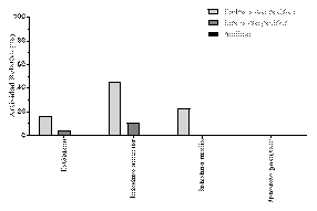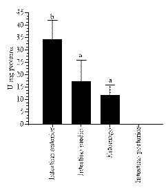 Esta especie presentó actividad proteolítica inespecífica ácida (estómago) y alcalina (intestino). La actividad específica de proteasa inespecífica en el estómago e intestino medio fue significativamente (P˂0,05) menor con relación a la actividad del intestino anterior. La actividad específica para este enzima fue de 34,3 ± 7,7 U/mg de proteína para la sección del intestino anterior. La actividad más baja se observó a nivel del estómago y fue de 11,8 ±4,1 U/mg de proteína (Fig. 2).