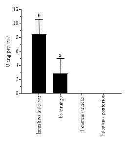 La actividad lipolítica en L. marmoratus se observó en estómago, intestino anterior y medio, siendo menor para este último. La actividad de lipasa fue significativamente (P˂0,05) mayor a nivel del intestino anterior (8,5±2,1 U/mg de proteína) y significativamente menor a nivel del intestino medio (0,033±0,0 U/mg de proteína) (Fig. 3).