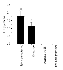 La actividad de amilasa se detectó a nivel de estómago, intestino anterior y medio. Sin embargo, esta actividad fue superior en el intestino anterior. En esta sección, la actividad de la amilasa fue de 0,36±0,07 U/mg de proteína. A nivel del estómago la actividad amilohidrolítica fue 0,23±0,05 U/mg de proteína (Fig. 4).