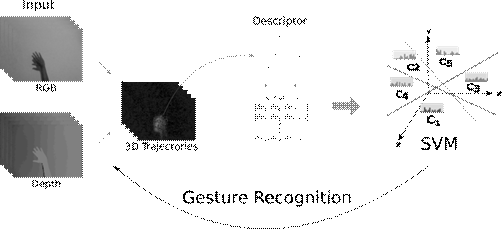 Finally, the occurrence histograms are computed for all the dataset, i.e., training and testing videos. The set of training histograms are used to compute a machine learning model that allows a posterior classification. In this work it was implemented a support vector machine strategy (SVM) because its well-known performance in different areas of recognition and the efficiency to obtain results [28], [29]. Then, for testing it was mapped the histogram occurrences to the previously trained SVM model and it was obtained automatically a label of the gesture in video. Fig. 3 shows the general scheme used to recognize particular RGB-D gestures from the proposed (3D + t) motion trajectories.