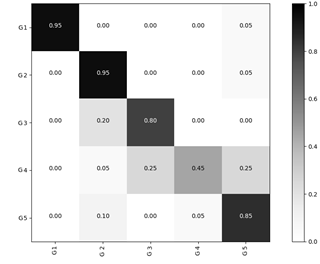Finally, a confusion matrix was computed using a total set of 5 gestures (Fig. 7). As it can be observed, almost all the gestures have a rate recognition above of 80%. Particularly, the gesture rotation reports some misclassifications because the kinematics similarities with the gestures 3 and 5. In general, the (3D + t ) motion trajectory demonstrates to be robust to represent kinematics gestures.