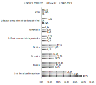 De los resultados anteriores Fig. 1, donde se analizaron los tres sectores intervenidos, se pudo resaltar que las empresas una vez ejecutan sus fases de transformación de la materia prima, generan residuos sólidos dentro de los cuales se encuentran retal no textil-avíos (tubos de tela, conos de hilo, hilazas, cierres, errajes, resortes, machos-hembras, tensores), retal-sesgos, desechos, embalaje y residuos reutilizables, los cuales en un gran porcentaje son dispuestos en la basura. En el área de trazo-corte el 48,5% de los residuos sólidos se los lleva el camión recolector, en el área de ensamble el 37,3% y en paquete completo el 29,8%.