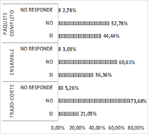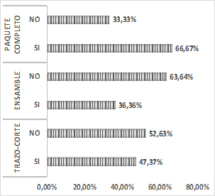 En la Fig. 5, más del 73% de las empresas indicaron “No” contar con planes de capacitación relacionados con la responsabilidad social. Es así, como en el área de trazo-corte el 73,68% de los encuestados, expresaron no tener una estrategia corporativa que permitiera favorecer los procesos productivos que conllevan a prácticas sostenibles, preservación y protección del medio ambiente, buen clima laboral y gestión social, en el área de ensamble el 75,76%, y en paquete completo el 77,78%.