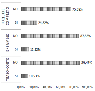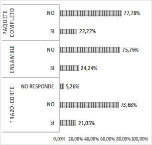 Una vez aplicada la encuesta y recogida la información, se procedió a elaborar el análisis de cada variable, donde se abordaron los diferentes procesos Trazo-Corte, Ensamble y Paquete completo. Luego se consolido la información total. Finalmente se realizó el comparativo de los diferentes procesos en gráficas y con porcentajes para cada variable.