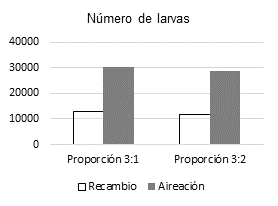 La mayor cantidad de larvas recolectadas en los estanques con aireación artificial, esto es, 30.091 (3:1) y 28.539 (3:2), mostraron que este ambiente fue el más apropiado, permitiendo un mejor entorno para la reproducción y, por ende, la producción de larvas con algo más de la mitad (56%), comparado con el sistema de manejo con recambio, es decir, 12.846 (3:1) y 11.605 (3:2) (Figura 1).