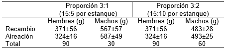 Se realizó el sexado previo a los animales destinados a la reproducción para identificar y separar hembras y machos con características fenotípicas de color homogéneo y talla reproductiva ajustada a la madurez sexual. Se utilizaron 120 reproductores (90 hembras y 30 machos), manteniendo la proporción 3:1, y 150 reproductores (90 hembras y 60 machos), para una proporción 3:2. Los animales se pesaron en una balanza analítica (OHAUS®, EEUU), y se realizó un tratamiento con sal marina para disminuir el estrés causado por la manipulación. Los pesos promedios en hembras y machos se observan en la Tabla 1.