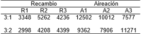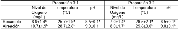 El nivel de Oxígeno mostró diferencias significativas (p<0.05) entre el recambio de agua y la aireación en ambas proporciones, observándose un mayor valor en los estanques con aireación, 10.7±1.9 (3:1) y 8.0±1.7 (3:2) mg/L), comparado con los estanques de recambio de agua 8.9±1.4 (3:1) y 7.0±1.4 (3:2) mg/L) (Tabla 2). El nivel de Oxígeno siempre fue más alto en horas del mediodía e inicio de la tarde, debido a que la luminosidad fue más alta, favoreciendo la fotosíntesis de los organismos fitoplanctónicos en los estanques, lo cual concuerda con otros autores [10], [11]. Los valores registrados de Oxígeno son superiores a 5 mg/L, lo cual está dentro del rango de cultivo del hibrido [8], [9].