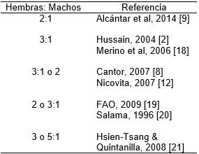 La proporción sugerida por varios autores en cultivos de tilapia, es superar el número de hembras con relación a los machos (Tabla 4), por lo que sigue siendo válida la observación.