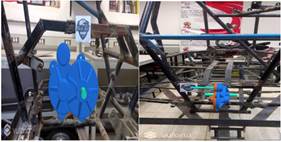 En la fig. 13, se muestra la ubicación del logo físico que se colocó en la estructura del BAJA, y los resultados de la visualización del modelo digital usando un smartphone LG stylus 4. Se observa que el espacio destinado a la nueva transmisión cumple con los requerimientos físicos necesarios para su instalación. Incluso se observa que el espacio sobrante se puede destinar a mejorar la geometría principal del vehículo.
