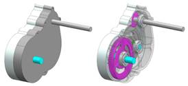 La transmisión actual tiene una relación de 9.22:1 con una masa de 8.60 Kg y un volumen de 1,904.59 cm3. La primera reducción es de 2.43:1 mientras que la segunda corresponde a una relación 3.80:1. El material de la tapa es de aluminio 6061 y el de los engranes y ejes es de acero AISI 8620. La caja cuenta con baleros RLS6 y usa aceite de transmisión manual Castrol. El diseño de la misma se muestra en la fig. 1.