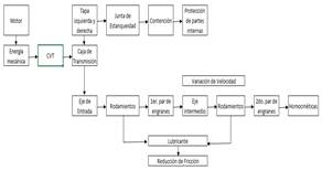 En esta etapa, se desglosan las funciones principales de la caja de transmisión partiendo de los elementos que alimentan al sistema como es el motor hacia funciones de protección de partes internas, homocinéticas, reducción de fricción y variación de velocidad. El detalle de la descomposición funcional se presenta en la fig. 3.
