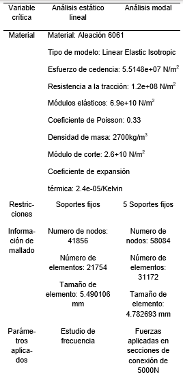 Mediante el uso de la plataforma de simulación Solidworks 2019, se realizan los estudios considerando el material, las restricciones, la información de mallado y los parámetros aplicados. La tabla 2 resume los valores obtenidos.