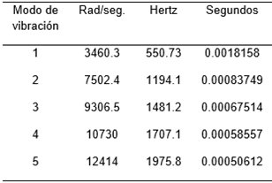 La tabla 3 detalla los cinco modos normales de vibración empleados, así como sus respectivos valores.