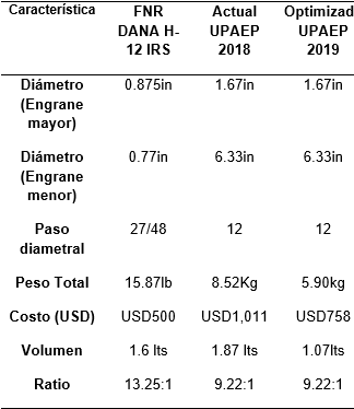 Con respecto a la mejora del sistema de transmisión se realizaron cambios en diversos diámetros, en el paso diametral con sus correspondientes afectaciones en peso total y costo de producción. La comparación final entre sistemas se observa en la tabla 4.