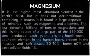 Los 18 elementos seleccionados fueron los siguientes: Oxígeno, Nitrógeno, Hidrógeno, Azufre, Fósforo, Potasio, Sodio, Cobalto, Selenio, Molibdeno, Cloro, Magnesio, Manganeso, Cobre, Zinc, Hierro, Calcio. De cada uno de ellos, se destacan los siguientes aspectos: