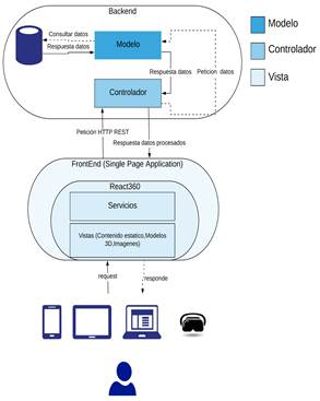 Para lograr el acople de los componentes y permitir a los estudiantes y docentes el uso del entorno virtual, primero, se planteó el patrón de diseño MVC (Modelo Vista Controlador) y tipo de arquitectura, en el cual se proyectaron las capas BackEnd, FrontEnd y los dispositivos a usar por un usuario final; segundo fue necesario la implementación de una base de dato, y como último se define el diagrama de flujo de la aplicación. El lenguaje que se usó en el BackEnd fue java y en el FrontEnd fue React 360. La herramienta que se utilizó para la realización de los diagramas fue LucidChart, esta permite realizar varios tipos de diagramas, entre ellos; UML, prototipos de software, esquemas de sitios WEB, entre otros.