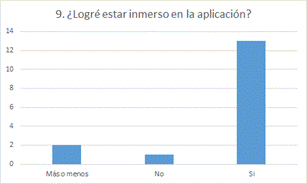 Al finalizar la interacción con la aplicación se les solicitó a las personas diligenciar una encuesta. Entre los aspectos evaluados por las personas que realizaron la validación, la mayoría de las personas afirmaban sentirse inmersos en la aplicación (ver Figura 16).