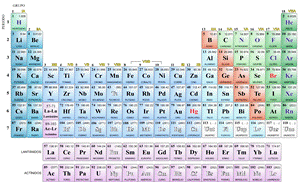 La distribución de los elementos de la Tabla Periódica (Ver Figura 3), fue presentada por primera vez por el químico Dmitri Mendeléiev; cada uno de los 118 elementos, está colocado a lo largo de filas o hileras, ordenadas de acuerdo a su número atómico creciente. Existen siete filas, cada una conforma un período. La longitud de los períodos se distribuye de la siguiente manera: el primero tiene dos elementos, los siguientes dos tienen ocho cada uno, luego 18 y 32, respectivamente, en los siguientes pares de períodos. Las columnas verticales forman grupos, de los cuales hay 18, basados en propiedades químicas similares, relativas al número de electrones en la capa exterior de los átomos, también llamada capa de valencia [34].