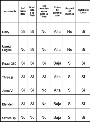En esta sección, se compararon las diferentes características, ventajas y desventajas de herramientas que ayudan a la implementación de entornos virtuales, con el propósito de tener criterios para la elección de la herramienta que más se adecue a la creación del entorno virtual de la tabla periódica (ver Tabla 1).