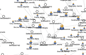 La herramienta permite construir la red de coautores y hacer filtros por palabras, año u autores, lo que permite a su vez navegar por el corpus construido, ver Figura 6 y 7.