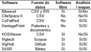 En la revisión de literatura se encuentra software tanto para tech mining como para science mapping. Según [16] Bibexcel es un toolbox que permite llevar a cabo análisis bibliométricos tales como distribuciones de frecuencia de citaciones, autores, análisis de coocurrencias, entre otros. Bibexcel maneja diferentes tipos de datos, sin embargo, en [16] se reporta que los nuevos usuarios perciben que la herramienta no es fácil de utilizar. Adicional a ello la herramienta no permite hacer análisis más robustos o visualizaciones, para ello Bibexcel permite exportar los archivos a formatos de archivos de SPSS [20] o Pajek [21].