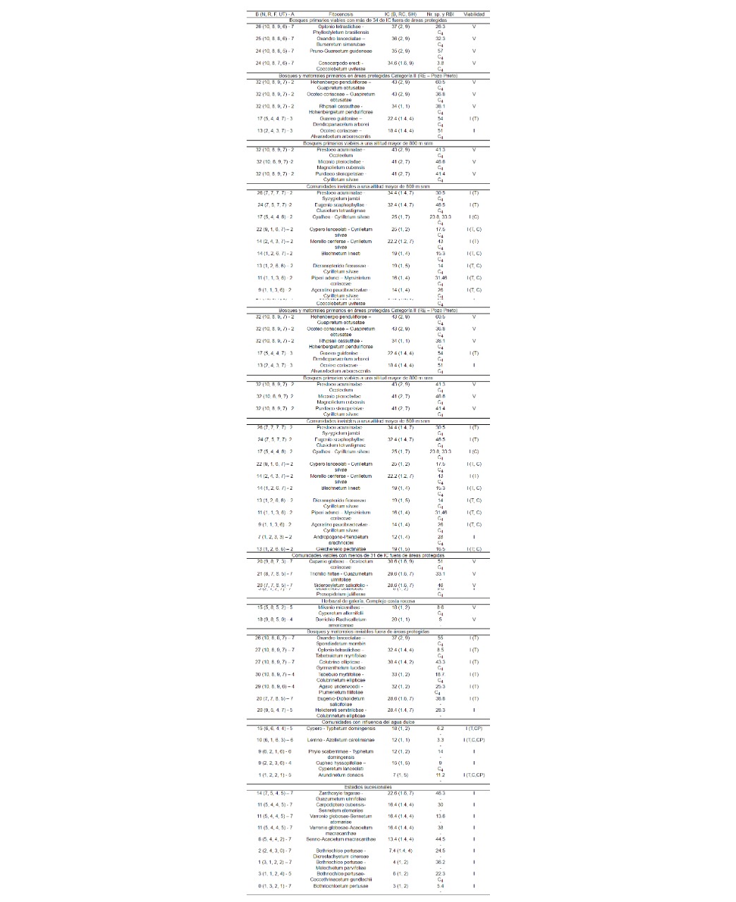 En concordancia con esto (Tab. 1), las cinco fitocenosis con un IC mayor de 40 y viables, por estar en un área protegida de Categoría II y/o por encima de los 800 m snm, no fueron recomendadas como objetos de conservación. A su vez, otras cuatro con un IC menor, de 34.6 a 37 y viables (Pruno-Guareetum guidoneae, Conocarpodo erecti-Coccolobetum uviferae, Oxandro lanceolatae-Burseretum simarubae, Oplonio tetrastichae-Phyllostyletum brasiliensis), por estar en la parte baja de la sierra y altamente amenazadas deben constituirse en objetos de conservación.