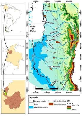 La zona de estudio tiene una extensión de 2.129 km2, se localiza en la región de Urabá, al noroccidente de Colombia, está limitada al norte por el Mar Caribe, al oriente por la Serranía de Abibe y al occidente por el Río León (Fig. 1). Fisiográficamente, las mayores alturas (que no superan 600 m.s.n.m) se encuentran en la Serranía de Abibe, desde donde se desciende a la planicie aluvial hasta la costa [18]. El clima es cálido tropical, con lluvias distribuidas entre los meses de marzo y noviembre registrando un promedio anual que varía entre 3.800 mm/año al sur y 2.100 mm/año al norte [19].