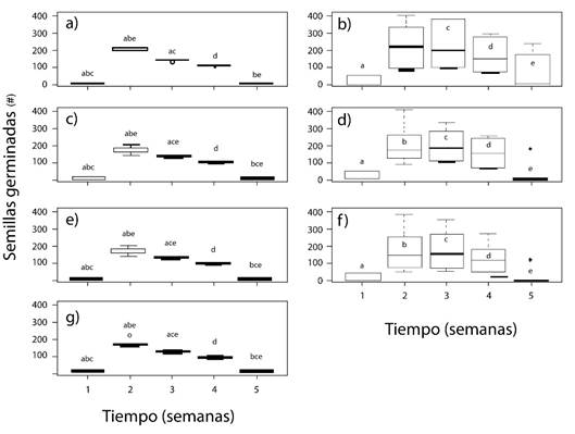 Estos resultados sugieren que el mejor tratamiento para la germinación de semillas de E. grandiflora fue el control (Figura 1), ya que alcanza un porcentaje de germinación de las semillas de más de un 90% en la segunda semana, al igual que el AG3, por lo cual no sería necesario adicionar esta hormona.