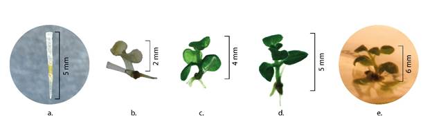 En este trabajo se encontró que es posible obtener plántulas in vitro de azafrán de raíz (Figura 2). Donde el desarrollo de las plántulas fue afectado por el tipo de gelificante y la aplicación de AIA.