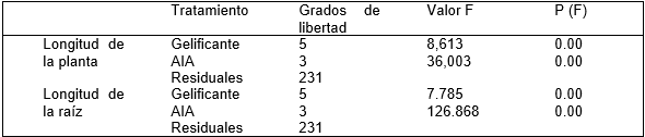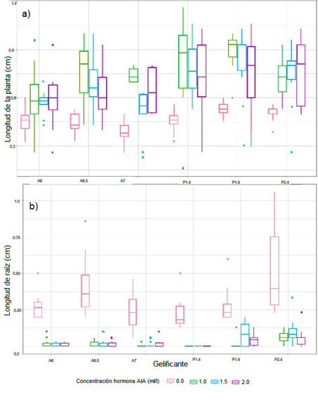 En este estudio, el gelificante Phytagel fue mejor para el crecimiento de las plántulas de E. grandiflora (p=0,00), aunque hubo una alta variación de los datos, la mayor longitud de la planta completa se logró con este gelificante en concentración de 1,9 g/l, en interacción con la concentración de AIA a 1.0 mg/l. (Tabla 1, Figura 3a). En contraste, la longitud de la raíz fue mejor en el gelificante Phytagel en concentración de 2.4 g/l y sin aplicación de hormona AIA (Tabla 1, Figura 3b).