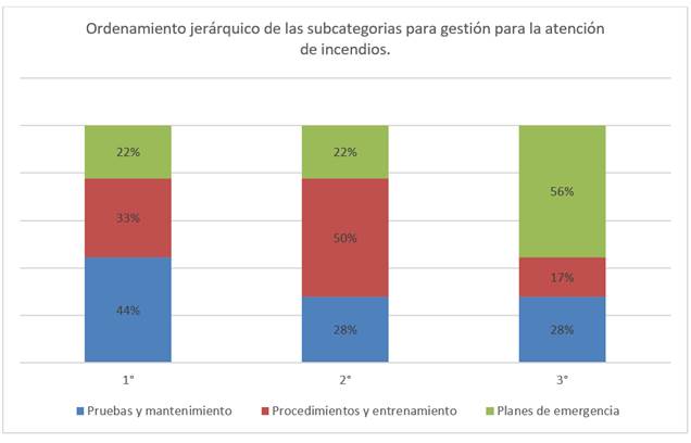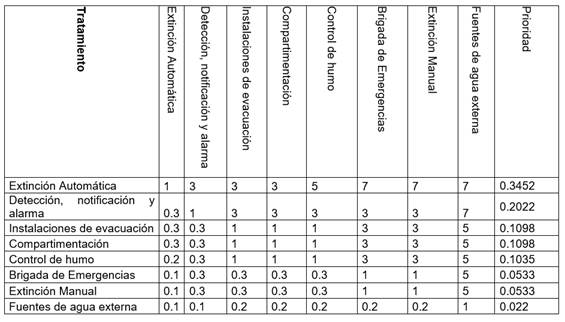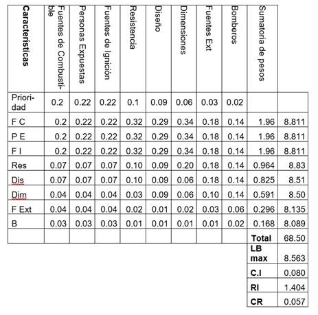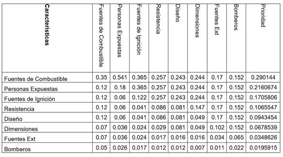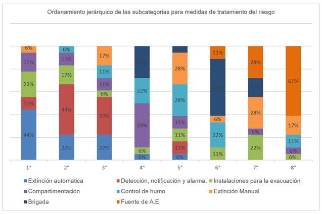 Para determinar el grado de importancia de cada subcategoría se conformó un panel de 18 expertos pertenecientes al sector del diseño de protecciones contra incendios, del sector asegurador y del sector Bomberos. Cada uno de los expertos aplicó el proceso de análisis jerárquico para realizar las comparaciones pareadas de las subcategorías dentro de cada categoría.