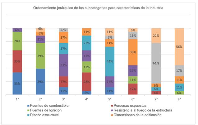 En el AHP de las características de la industria, se presentó una división entre los expertos que consideraban que los factores asociados a las fuentes de combustible y de ignición eran los más relevantes y entre los expertos que consideraban que las personas expuestas era el factor más relevante. Esta situación se puede ver explicada en la muy conocida practica de decir que el propósito principal de la gestión del riesgo de incendio es proteger la vida.