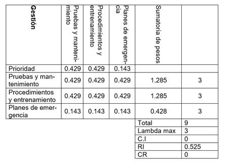Para validar el nivel de coherencia conseguido en las matrices de comparación para cada una de las categorías se realizó el cálculo de consistencia y se validó que su valor fuera inferior al 10%, un valor adecuado cuando el número de factores comparados es inferior a 10 [7].
