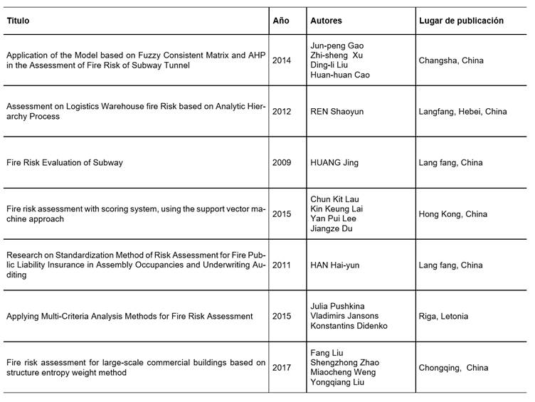 Después de la revisión de los artículos que se muestran en la tabla 2 se seleccionaron las categorías definidas en el artículo “Applying Multi-Criteria Analysis Methods for Fire Risk Assessment ” [5], por plantear una estructura jerárquica aplicable a todos los artículos y centrarse en el estudio del riesgo de incendio de manera general: