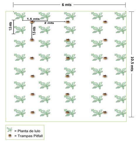Se realizaron muestreos durante ocho días, con intervalos de 15 días. Las capturas manuales se realizaron de 7:00 a 9:00 am, de 1:00 a 3:00 pm, y de 5:00 a 7:00 pm, en donde se inspeccionaron cada una las estructuras vegetativas y reproductivas de las plantas (hojas, tallos, flores, frutos). La captura con trampa, se efectuó por medio de trampas pitfall sin atrayentes, ubicadas a una distancia de 1,5 x 2 m (Figura 1). La intensidad de muestreo fue de 308 horas/hombre para las capturas manuales y 1344 horas para capturas con trampas.