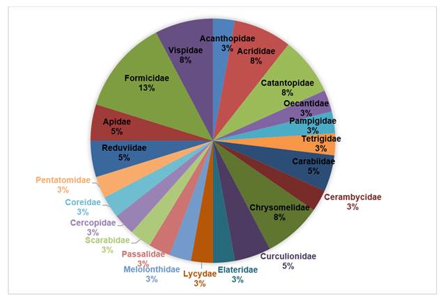 Las familias más representativas según la cantidad de géneros colectados en el cultivo de S. sessiliflorum fueron: Formicidae con cinco (13%), Acrididae, Chrysomelidae y Vespidae con tres (8%), seguidos por Carabidae, Curculionidae, Reduviidae, Apidae y Catantopidae con dos (5%). Por otro lado, las de menor representatividad fueron: Cerambycidae, Melolonthidae, Pentatomidae, Acanthopidae, Pamphagidae y Tetrigidae, todas con un solo género (3%; Figura 2).