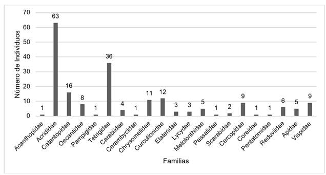 Por otra parte, las familias con mayor número de individuos colectados fueron: Acrididae con 63, que equivalen al (32%), Tetrigidae con 36, (18%), Catantopidae 16, (8%). Las menos abundantes fueron: Elateridae y Lycidae con tres individuos, Scarabaeidae con dos; por último, se encuentran las familias Cerambycidae, Pamphagidae, Pentatomidae, Coreidae y Acanthopidae con un individuo cada una. Todas con representación porcentual del (1%; Figura 3).