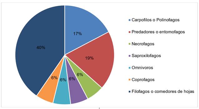 La estructura trófica de los insectos asociados a S. sessiliflorum determinó que: los insectos Fitófagos fueron el gremio más diverso y abundante en cuanto al número de familias y géneros colectados con 16 y 24 respectivamente, seguido de los Zoófagos con seis familias y diez géneros, luego siguen los Saprófagos con tres familias y tres géneros, y Omnívoros con una familia y un género. De igual forma, el grupo funcional más diverso fue el de los Filófagos o comedores de hojas con (n=21 géneros colectados; 40%), seguido de Predadores o entomófagos (n=10; 19%), y Carpofìlos o polífagos (n=9; 17%; Figura 4).