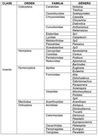 Se determinó, que los órdenes más representativos en cuanto al número de familias colectadas fueron: Coleoptera con 9, seguido de Orthoptera con 5, y los de menos representación fueron Hemiptera con 4, Hymenoptera con 3, y Mantodea con una (Tabla 1).