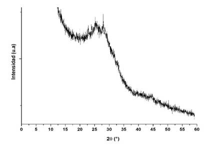La Figura 2 muestra el difractograma del biovidrio obtenido, en el que se puede verificar la naturaleza predominantemente amorfa del biovidrio. Así mismo, alrededor del intervalo 17° a 35° 2θ, se observa un pico amplio que de acuerdo con la literatura está asociado a la fase whitlockita [13].