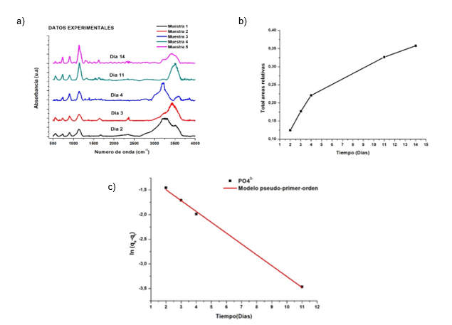 Por otra parte, el gráfico de la figura 3c, describe el modelo cinético que mejor se ajustó al perfil de incremento de las áreas totales relativas de la figura 3b, donde la capacidad de biomineralización de los iones PO43- fue calculado mediante la ecuación de pseudo- primer-orden de Lagergren, representado como [16]: